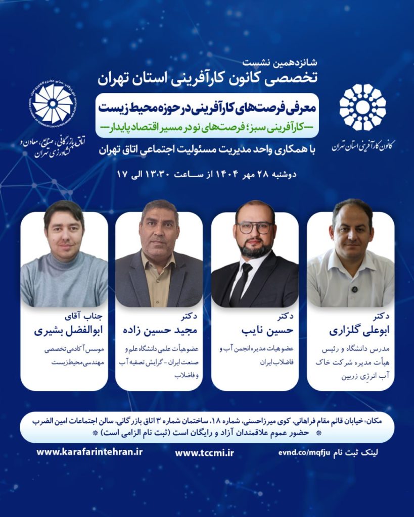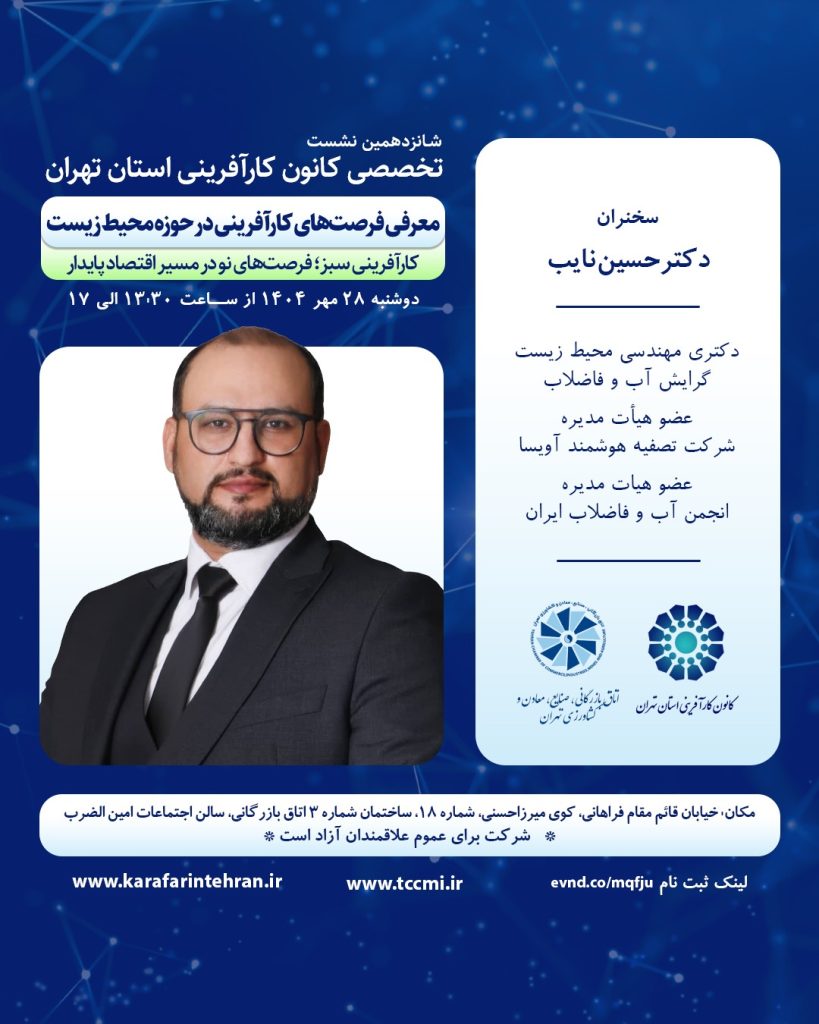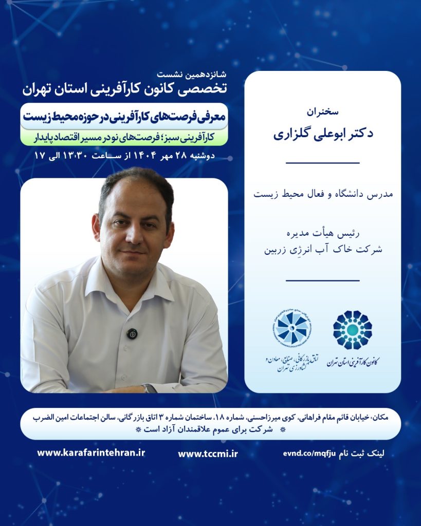 شانزدهمین نشست تخصصی کانون کارآفرینی استان تهران با عنوان «کارآفرینی و صنعت احداث و انرژی» با همکاری مدیریت مسئولیت اجتماعی اتاق بازرگانی، صنایع، معادن و کشاورزی تهران به شرح زیر برگزار می‌شود.